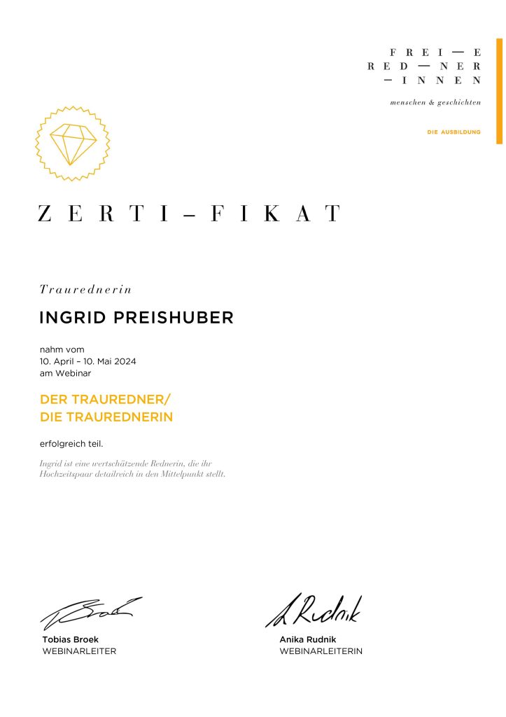 Mein Name ist Ingrid Preishuber und ich bin ausgebildete Freie Rednerin (durch die Freie-Redner-Ausbildung). Ich liebe es, Euch als Brautpaar auf dem Weg zu Eurer individuellen Traumhochzeit zu begleiten! Dazu biete ich Euch eine zuverlässige Zeremonie, die nach Euren Wünschen durch mich hindurch begleitet wird.